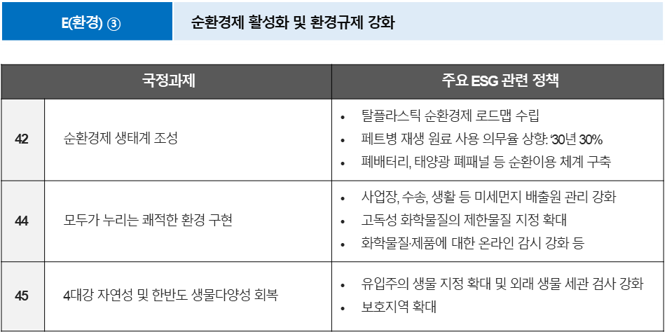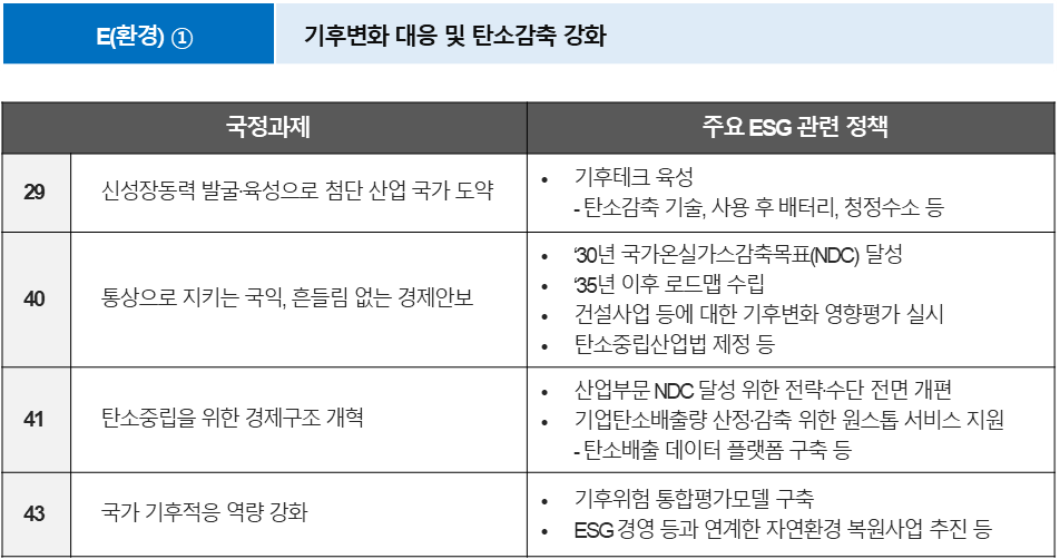 정부는 철강, 석유업계를 대상으로 수소환원제철 기술 상용화, 바이오 원료 전환 등 탄소감축 효율이 높은 프로젝트에 R&D 자금을 지원하고 향후 시멘트, 반도체 산업 등으로도 지원 범위를 넓힐 계획입니다. 또한, 2024년부터 개발중인 기업 탄소배출량 데이터 플랫폼은 EU의 디지털제품여권(DPP) 규제에 대응하기 위한 것으로 주요 수출기업과 협력사의 탄소배출량 정보를 연계∙관리하기 위한 목적으로 구축 중입니다.  한편, 환경부는 제4차 국가기후위기적응대책(2023~2027년)과 제5차 국가생물다양성전략에 따라 자연생태계 복원과 보호지역 확대 정책을 강화할 것으로 보입니다.