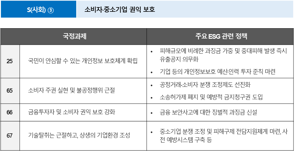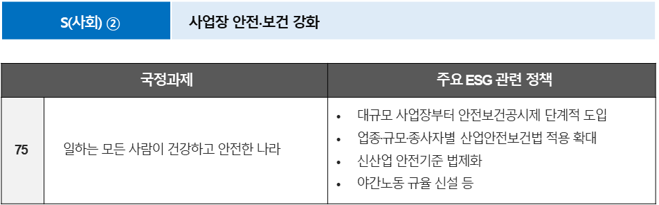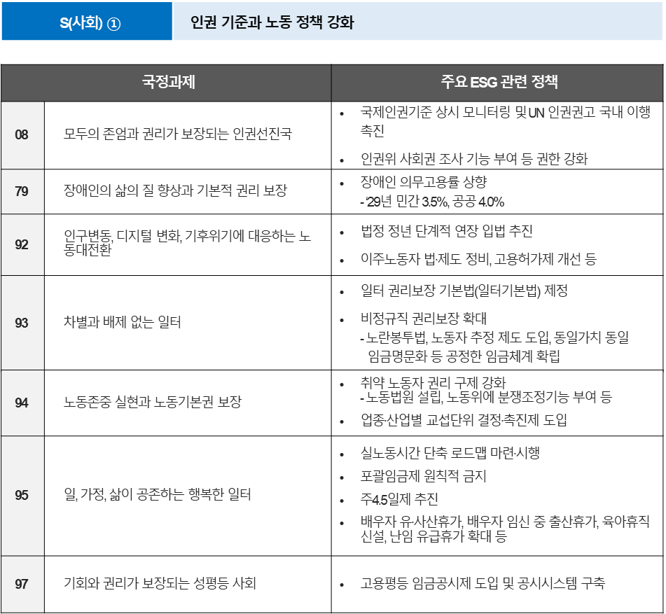 이번에 발표된 국정과제 중 인권·노동 정책 관련 과제는 모두 7개로 ESG 관련 과제 중 가장 많은 비중을 차지합니다. 그만큼 정부의 노동 정책 개선 의지가 금번 국정과제 선정에서 강하게 반영된 것으로 보입니다. 인권·노동 정책 변화는 기업의 인력운영, 비용구조, 법률 리스크에 큰 영향을 주는 만큼 정책 변화와 입법 현황을 지속적으로 모니터링하면서 노무 관리 역량을 대폭 강화해야 할 필요가 있습니다.  우선, 기업내 인권 현황을 점검해야 합니다. 국가인권위원회, UNGP등에서 제시하는 인권영향평가 기준에 따라 기업 구성원들이 인지하는 인권 수준을 주기적으로 모니터링하고 취약한 영역은 지속적으로 개선해야 합니다. 노란봉투법과 근로자 추정제에 따라 사용자 의무와 범위가 확대될 가능성이 커졌으므로 하도급, 파견업체, 플랫폼 근로자의 노동 환경을 점검하고 추후에 발생할 수 있는 단체교섭 요구에 대비해야 합니다. 정년 연장에 대비하여 60세 이후 계속고용을 위한 적합 직무 개발, 임금피크제 등의 급여체계 정비를 검토해야 합니다. 또한, 근로시간 관리 강화를 통해 포괄임금제 금지와 주 4.5일제 도입에 대비하고, 일·가정 양립을 위한 사내 HR 제도 전반에 대한 점검도 필요합니다.
