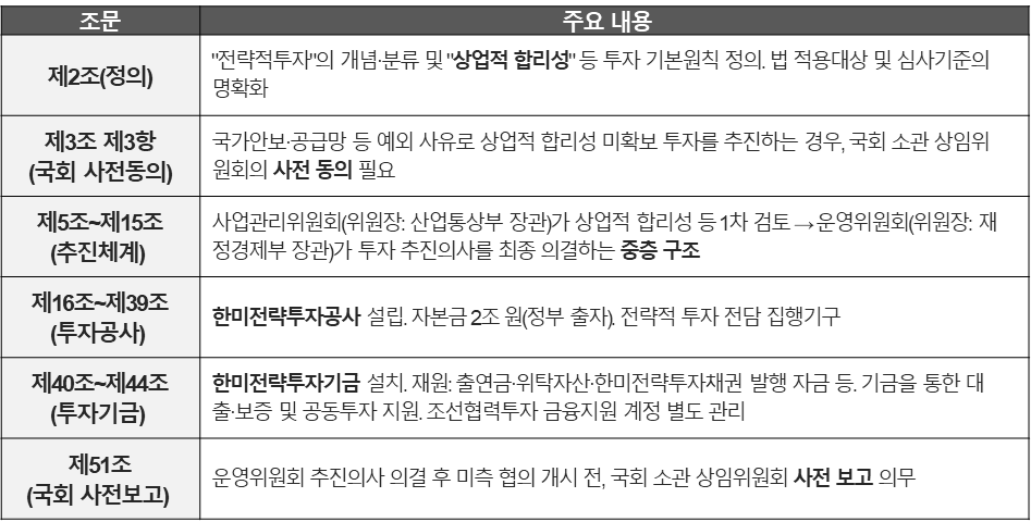 아울러 본 법은 전략적 투자의 실행력을 담보하기 위해 두 가지 전담 기구—한미전략투자공사 및 한미전략투자기금—의 설립 근거를 마련하였습니다.