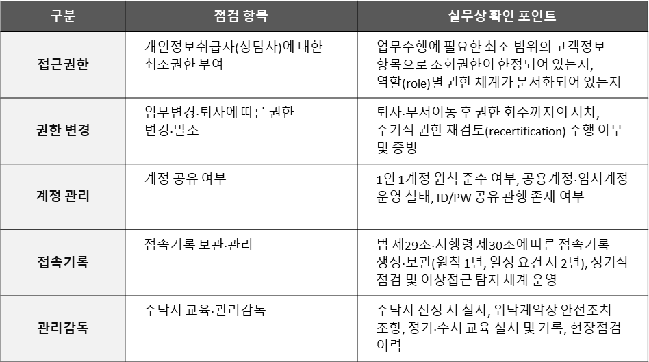 이번 점검은 상담사의 접근권한 최소부여, 업무변경 시 권한 변경·말소, 계정공유, 접속기록 보관·관리, 수탁사 교육·관리감독 등 안전조치의무(법 제29조) 이행 전반을 집중 확인하며, 미비점 발견 시 시정권고 등 후속조치가 예정되어 있습니다.