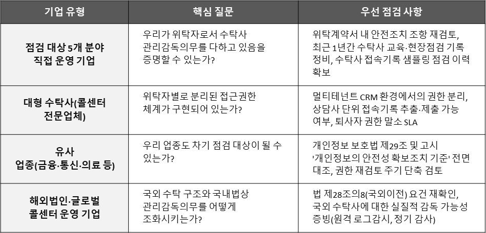 이번 점검은 5개 분야로 명시되었으나, 고객센터를 통한 개인정보 처리 구조는 해당 업종에 국한되지 않습니다. 유사한 리스크 구조를 가진 산업군에서도 향후 점검 범위가 확장될 가능성이 있으며, 선제적 자가진단이 필요합니다.