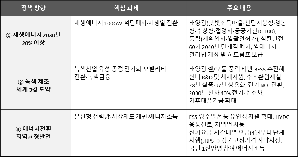 핵심 변화는 ① 2030년 재생에너지 발전비중 20% 이상(100GW) 조기 달성, ② 석탄발전소 60기의 2040년까지 단계적 폐지, ③ 산업공정·수송·난방 전 영역의 전기화·탈탄소화, ④ 지역별 차등 전기요금 및 장기고정가격 계약시장 도입 등 전력시장 제도 전면 개편입니다.