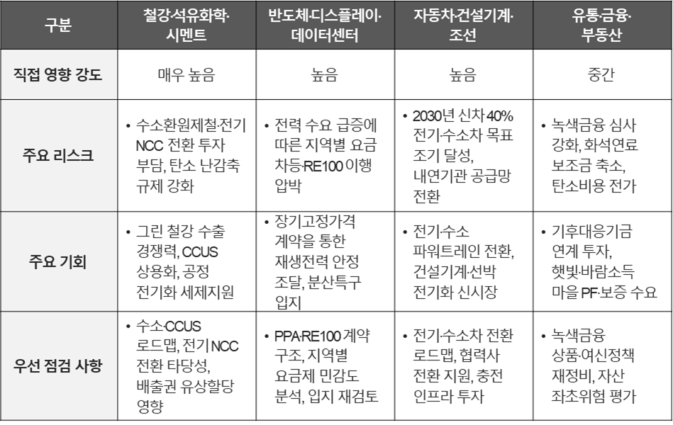 이번 계획은 단순한 에너지 정책을 넘어, 기업의 비용 구조, 투자 의사결정, 공급망 운영 및 공시 대응에까지 영향을 줄 수 있습니다. 영향의 경로와 시급성은 업종별로 상이하며, 각 기업은 아래 매트릭스를 기준으로 자사 리스크·기회 포지션을 진단할 필요가 있습니다.