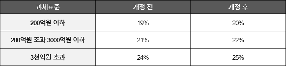 • 법인세율을 각 과세표준 구간별로 1%씩 상향함(법인세법 제55조 제1항 개정).