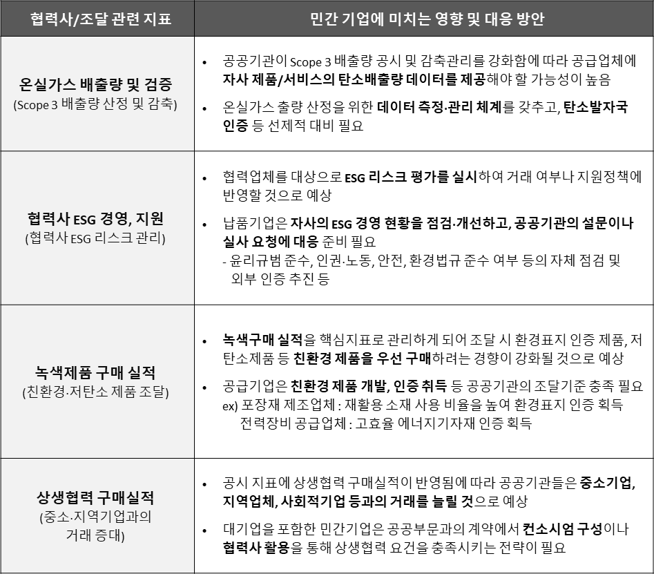 아래 표에서는 이번 가이드라인에 담긴 주요 협력사∙조달 관련 지표들과 그에 따른 민간기업의 영향 및 대응방안을 정리하였습니다.
