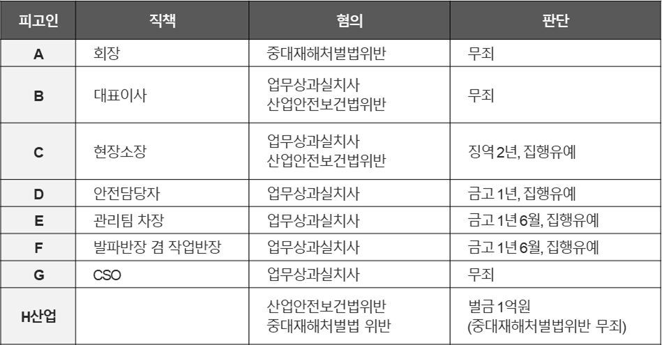 반면, 아래 표에서 확인되는 것과 같이 현장 실무자 4명에 대해서는 모두 유죄 판결이 내려졌습니다.